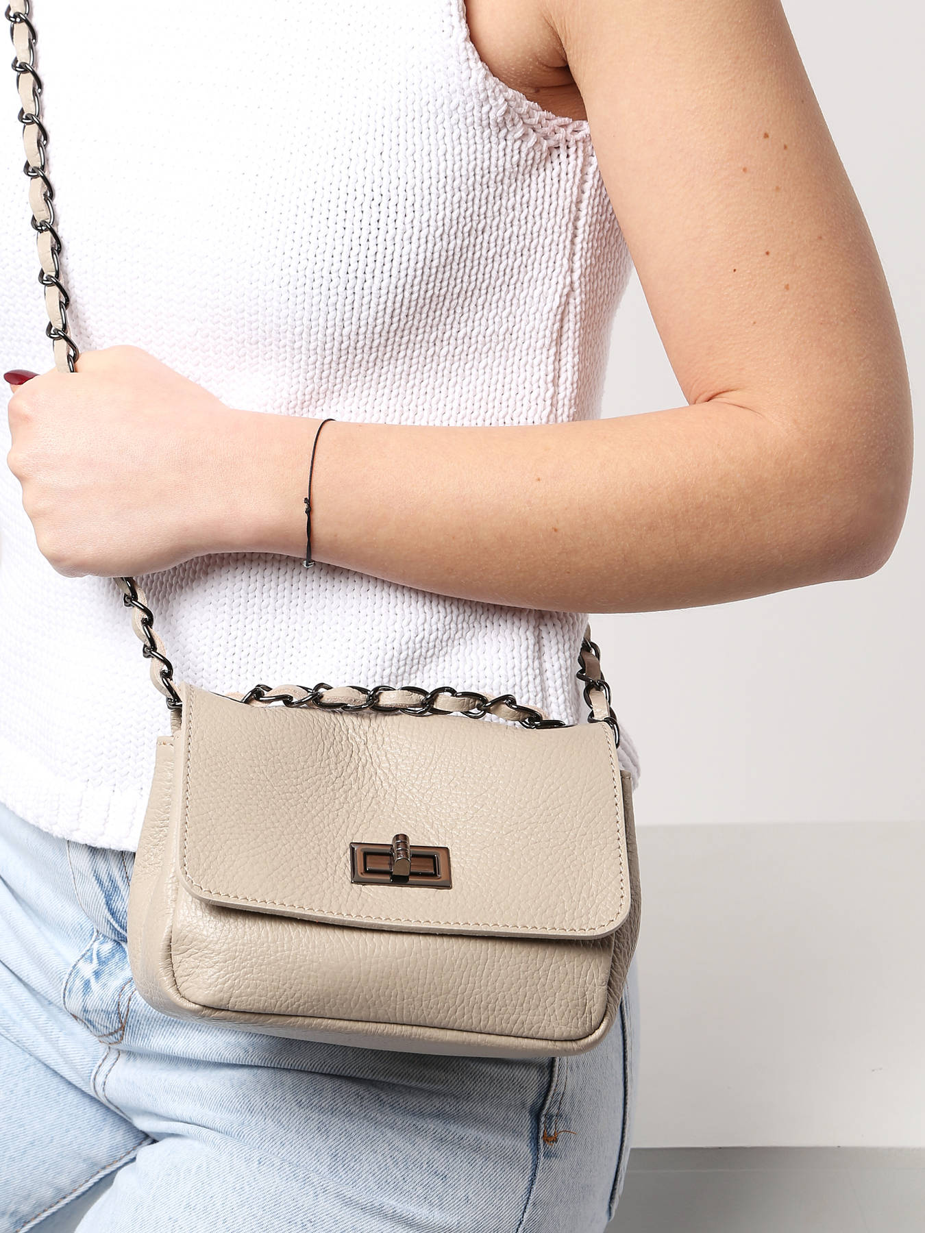 La bandouliere deux matières donne un très joli détail. Le cuir grainé offre une belle couleur. Il n'est pas encombrant. La place est suffisante pour le portable et le porte monnaie. Parfait !